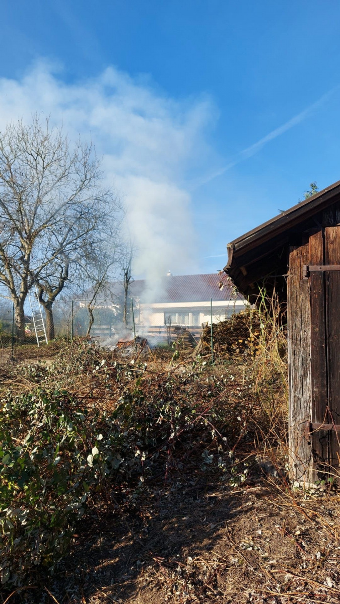 Am Einsatzort stellte sich heraus, dass auf einem Privatgrundstück Reisig und Müll verbrannt wurden. Aufgrund der Nähe des Feuers zu einem Holzstapel und einer angrenzenden Scheune bestand die Gefahr, dass die Flammen auf diese übergreifen könnten.