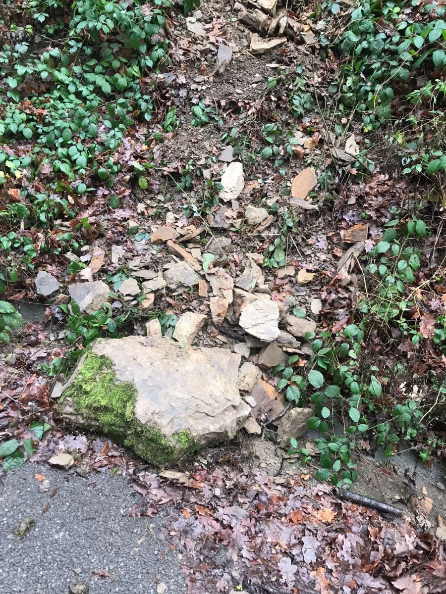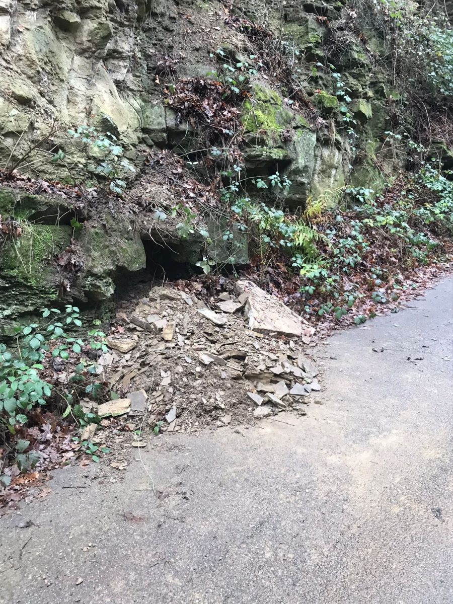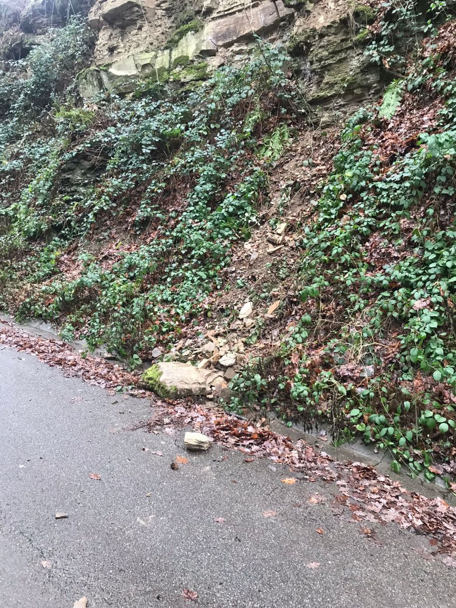 Durch die Regenfälle der letzten Stunden, ist dort ein Fels an einem Hang abgebrochen und auf die Straße gefallen.