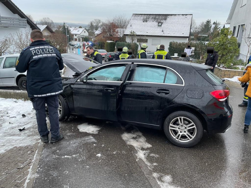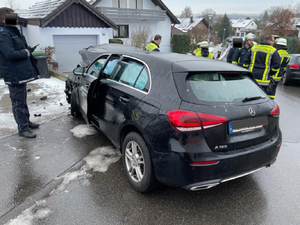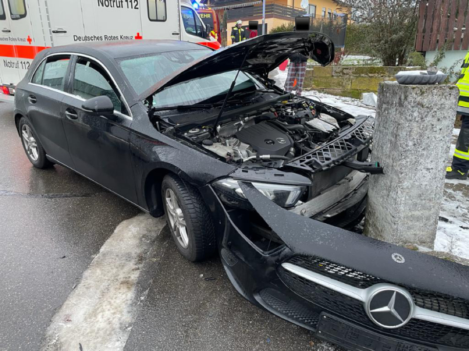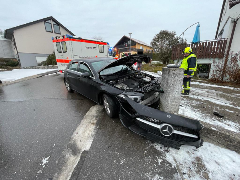 Durch Glatteis auf der Straße fuhr ein PKW gegen eine Mauer. Die Feuerwehr betreute die Fahrerin bis zum Eintreffen des Rettungsdienst.
