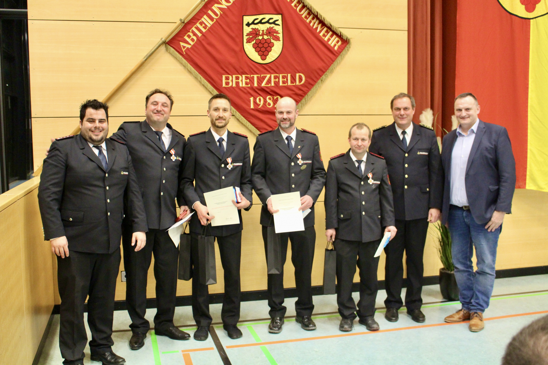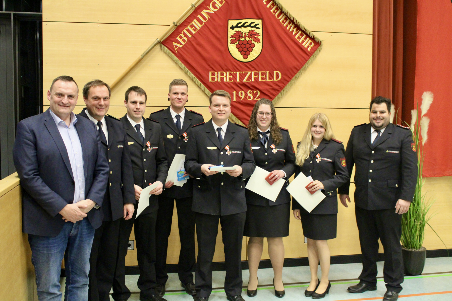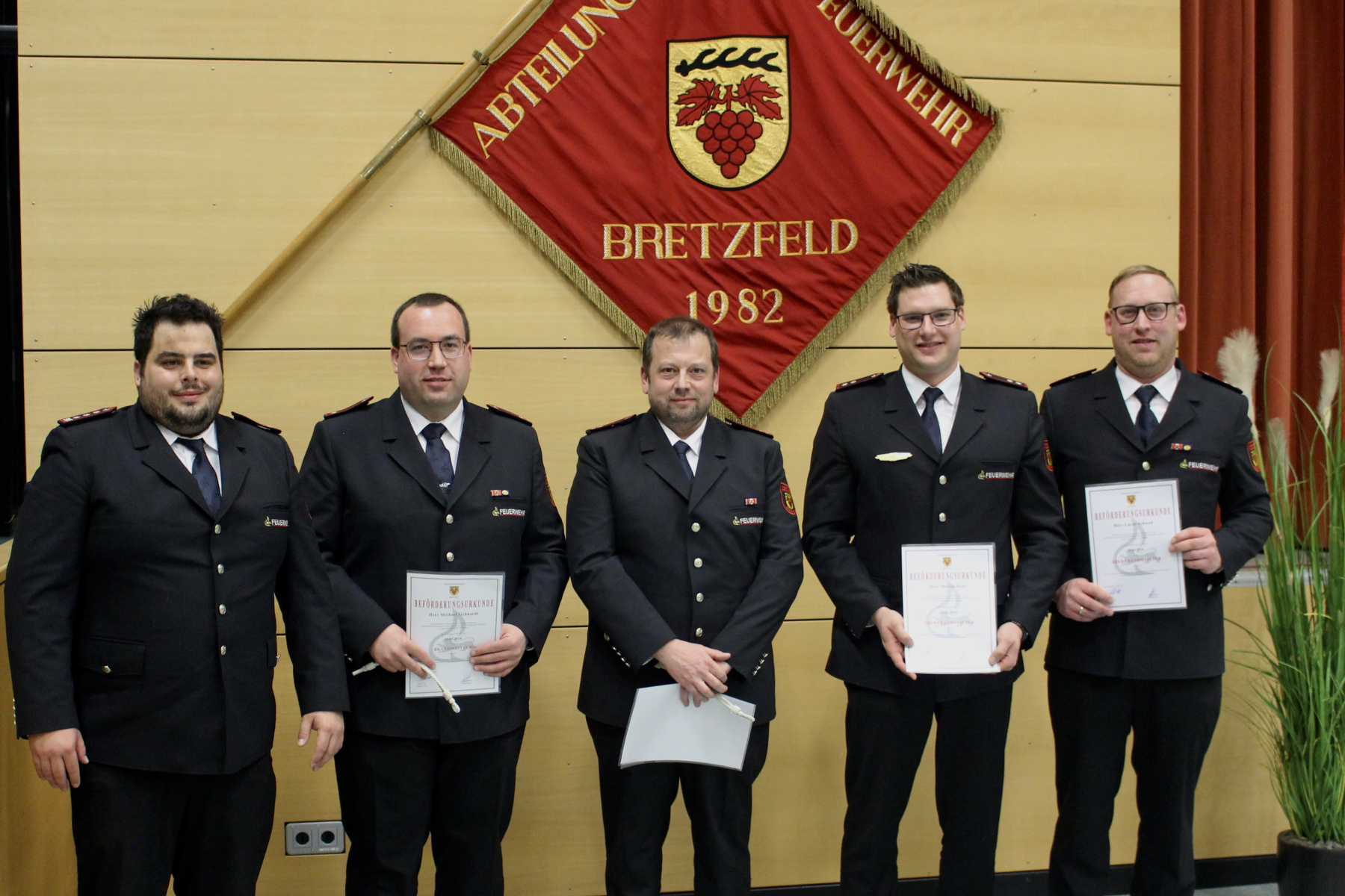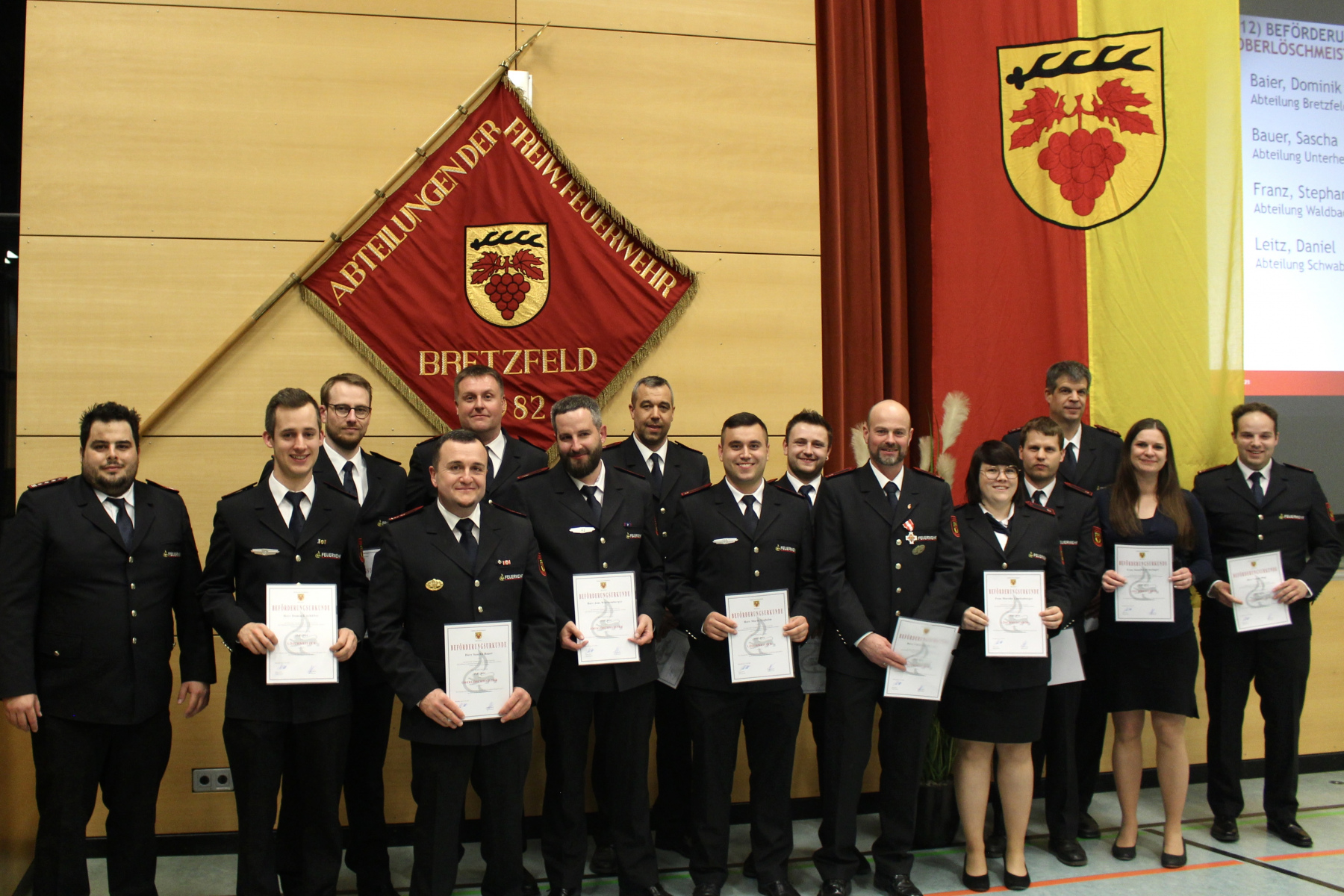 Anschließend wurden noch Beförderungen zum Feuerwehrmann/Feuerwehrfrau, zum Oberfeuerwehrmann/ Oberfeuerwehrfrau, zum Hauptfeuerwehrmann, zum Löschmeister/ Löschmeisterin, zum Oberlöschmeister, zum Brandmeister und zum Oberbrandmeister vorgenommen.
